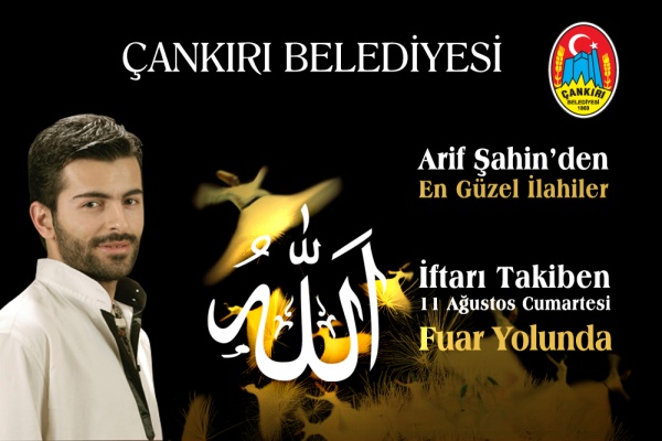 İlahi konseri verecek olan sanatçı Arif Şahin,  Çankırı Belediyesi tarafından 11 Ağustos 2012 Cumartesi günü, Buğday Pazarı Mahallesi Migros önünde verilecek iftar yemeğinin ardından sahne alacak.