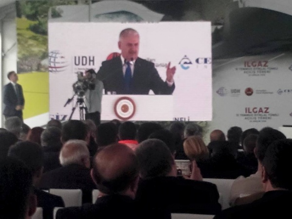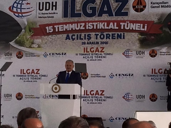 Açılış öncesi konuşma yapan Başbakan Binali Yıldırım, "Ilgaz 15 Temmuz İstiklal Tüneli de geleceğimizin sembolü olan en güzel eser oldu. 700 milyonu aşan bu proje ile Çankırı Kastamonu, Ankara'ya komşu oluyor. Çankırı Kastamonu arası düşecek. Zorluklar bugün itibariyle tarihe kavuşuyor. 40 dakikalık mesafeyi 5 dakikada geçeceksiniz. 2 tünel var biri gidiş biri geliş. Toplam 11 kilometre. Kastamonu Çankırı arası mesafe de zaman da kısalıyor. Yolları da dahil ettiğimizde 20 kilometrelik bir uzunluğu var. 8 milyon litre yakıttan tasarruf, 346 bin zamandan tasarruf sağlayacağız. Memleketin ekonomisine yılda 40 trilyon katkı sağlayacağız. Bu tünel hayat kurtaracak. İç Anadolu'yu Batı ve Orta Karadeniz'e bağlıyoruz. Sadece Kastamonu değil, Karadeniz'e hizmet ediyor. Vurur yüze ifadesi sizi seviyoruz bitanesi. Ankara'ya limanına da transit bağlanmış olacak. Nakliyeci kardeşlerimiz dört gözle bekliyordu. Araçlarımızın Ilgaz Dağı'ndan yolda kalma ihtimali kalktı. Laf aramızda ben kaldım yolda. Sıkıntısını bilirim. Kastamonu'dan Çankırı'ya dünürümüze kız istemeye gitmiştik. Yukarıya tırmanırken orada kaldık ve kararı verdik bu tünel yapılmalı. Başa gelince daha iyi anlaşılıyor. Taş üstüne taş koyan bu memleket için herkesten Allah razı olsun." dedi.