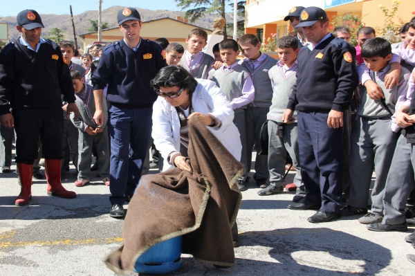 Daha sonra itfaiye ekiplerimiz bir öğrenci ve bir öğretmeni merdivenli itfaiye aracıyla okulun en üst katından senaryo gereği kurtardı.Okul bahçesinde yangın söndürme tüpüyle yakılan ateş öğrenciler tarafından söndürüldü.Ardından gaz kaçıran ve yangına sebebiyet veren mutfak tüpünün söndürülme şekli gösterilidi.