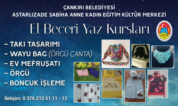 Çankırı Belediyesi, yaz döneminde de Çankırı’da yaşayan kadınlar için bilgi ve beceri kursları düzenledi.  Kadınlardan gelen taleplere göre yıl içerisinde 30 farklı alanda kurs düzenleyen Merkez, yaz döneminde ise takı tasarımı, ev mefruşatı, örgü, boncuk işleme ve wayu bag (örgü çanta) kursları ile hizmete devam edecek.