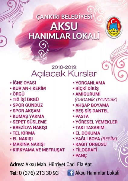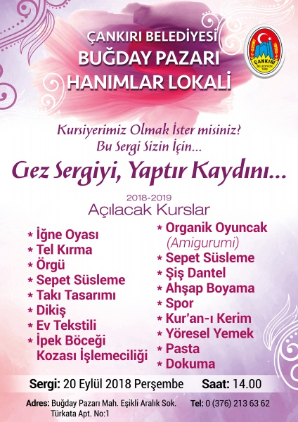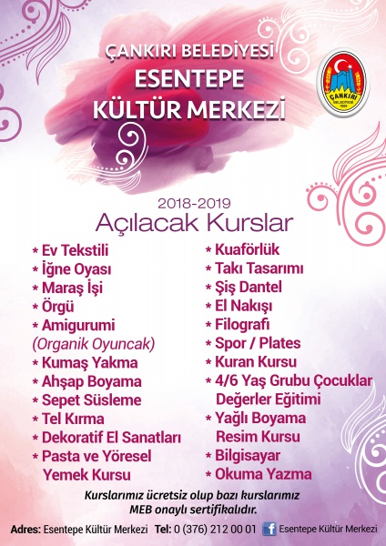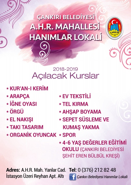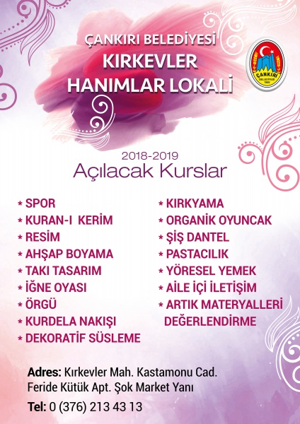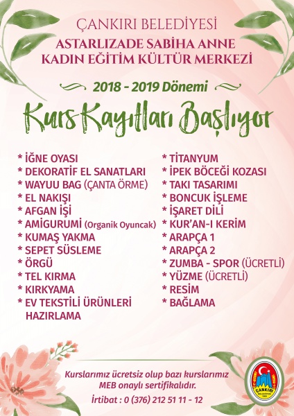 Çankırı Belediyesi, kış sezonuna yeni kursiyerler ile yola çıkmaya hazırlanıyor. Çankırı’da yaşayan kadınlara yönelik bu sezonda da birçok alanda bilgi, beceri ve gelişim kursları açıldı. Kadın Eğitim Kültür Merkezleri ve Hanım Lokallerinde verilecek kurslar için kayıtlar alınmaya başlandı. Kadınların yoğun ilgi gösterdiği kurslar arasında; Kura’n-ı Kerim, Arapça, örgü, kırkyama, sepet süsleme, pastacılık, ahşap boyama, resim, seramik boyama, iğne oyası, ev mefruşatı, kurdele nakışı, el ve makine nakışı, brezilya nakışı, takı tasarımı, şiş dantel, organik oyuncak, kumaş boyama, kumaş yakma, ev tekstili, yöresel yemek ve pastacılık, 4–6 yaş grubu değerler eğitimi, tel kırma, yorganlama, bilgisayar, beş şiş dantel, panç, dekoratif el sanatları, koro-bağlama, üç boyutlu kâğıt rölyef, hafızlık, türban tasarım ve kuaförlük, kâğıt kıvırma sanatı, dikiş, atık materyalleri değerlendirme, aile içi iletişim, titanyum, çanta örme, ev tekstil ürünleri hazırlama, Afgan işi, gibi kurslar yer alıyor. Astarlızade Sabiha Anne Kadın Eğitim Kültür Merkezinde ise farklı olarak yüzme, hamam ve sauna hizmetlerinden belli bir ücret karşılığında faydalanılabilecek.