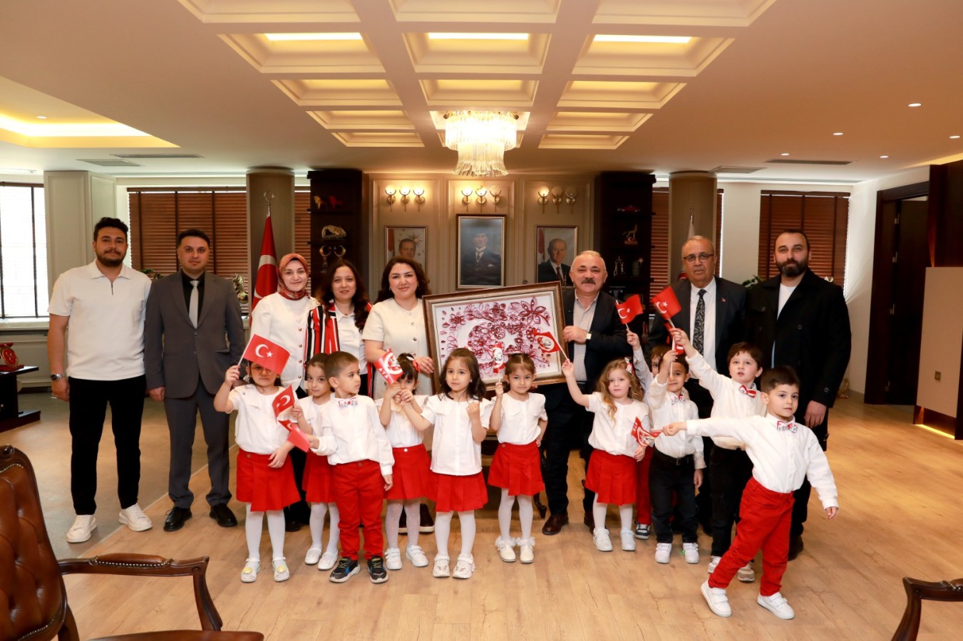 Renkli görüntülere sahne olan ziyarette çocuklar, ellerinde Türk bayrakları ile makam odasını adeta bayram yerine çevirdi. Başkan Esen’in boynuna sevgi ile sarılan minikler, sırayla makam koltuğuna oturarak hayallerini dile getirdi.