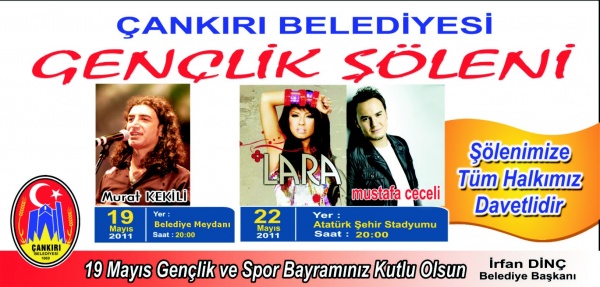 19 Mayıs Perşembe günü, belediye meydanında saat 20:00’da ünlü Rock yıldızı Murat Kekilli tarafından ilk konser verilirken, 22 Mayıs Pazar günü yine ünlü popçu Lara ve aynı zamanda yakından tanığımız Çankırılı hemşerimiz ünlü Pop sanatçısı Mustafa Ceceli’nin Atatürk Şehir stadyumundaki konserleriyle tüm gençler ve Çankırı halkı bir araya gelecek.