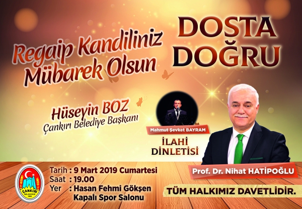 Kaya Tuzunun Başkenti, Yaranlar Diyarı Çankırı, ünlü İlahiyatçı Prof. Dr. Nihat Hatipoğlu’nu ağırlayacak. Regaip Kandili münasebeti ile Çankırı Belediyesince düzenlenen etkinlik kapsamında “Nihat Hatipoğlu ile Dosta Doğru” programı özel içeriği ile Çankırı halkı ile buluşacak. Programa ilahi dinletileri de renk katacak. Belediye Başkanı Hüseyin Boz, önemli bir ismi Çankırı’da ağırlamaktan mutluluk duyacaklarını belirterek tüm hemşehrilerini programa davet etti.