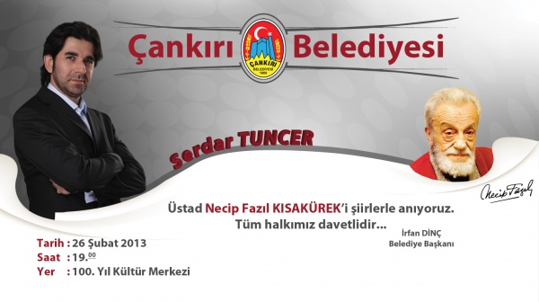 26 Şubat 2013 Salı günü saat 19.00’da 100. Yıl Kültür Merkezinde düzenlenecek gecede Necip Fazıl Kısakürek’in birçok eseri, şair Serdar Tuncer’in yorumu ile yeniden hayat bulacak.