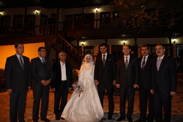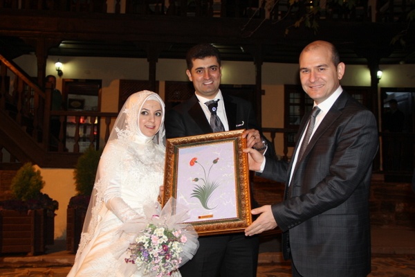 Süleyman Soylu, Belediye Başkanı İrfan Dinç ile birlikte medreseyi ziyarete gelen gelin ve damada ebru tablo ve tuz lambası hediye etti.