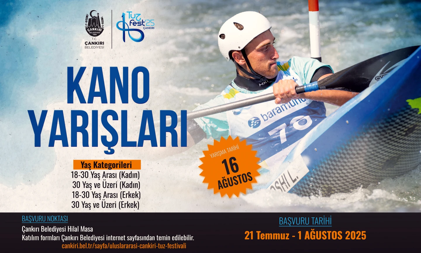 Festival ziyaretçileri, Tatlıçay’da yapılacak kano yarışları ile kıyasıya çekişmeye şahitlik edecek. TUZFEST’25 kano yarışları, 16 Ağustos Cumartesi günü Yamuçlar mevkiinde yapılacak. Yarışma; 18-30 yaş ile 30 yaş ve üzeri kadın-erkek grupları olmak üzere dört farklı kategoride gerçekleştirilecek.