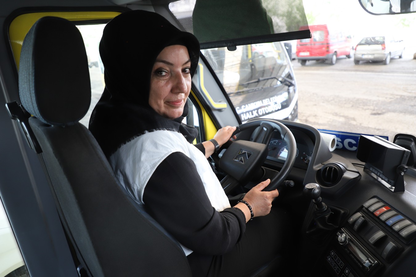 Taş, yapılan mülakatların ardından direksiyon başına geçti. Kentteki ikinci kadın otobüs şoförü olan Taş’ın güler yüzü halk otobüsünü kullanan yolcuları da memnun ediyor.