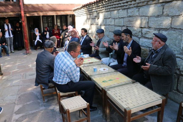 Yaşlılar, yapılan ebru çalışmalarının ardından tarihi mekan eşliğinde hoş sohbetlere daldılar. Programda, şehit ve gazilerimiz için de dualar edildi.