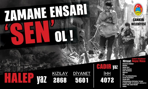 Çankırı Belediyesi’nin insanlık dramının yaşandığı Halep’teki kardeşleri için başlattığı yardım kampanyası tüm hızı ile devam ediyor. Suriye’nin kadim şehri Halep’te insanlığın vicdanını sorgulatan hunharca katliama karşı Çankırılılar tek yürek oluyor. Çankırı Belediyesi “Zamane Ensarı Sen Ol” sloganı ile başlattığı Halep’e yardım kampanyasında vatandaşları zamanın ensarı olmaya davet ediyor.
